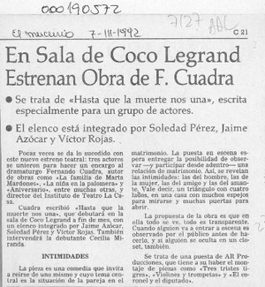 En sala de Coco Legrand estrenan obra de F. Cuadra [artículo]. El Mercurio (Santiago). -- mar. 7, 1992, p. C21 .