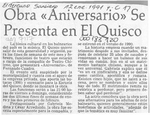 Obra "Aniversario" se presenta en El Quisco [artículo]. El Mercurio (Santiago). -- ene. 12, 1991, p. C17 .