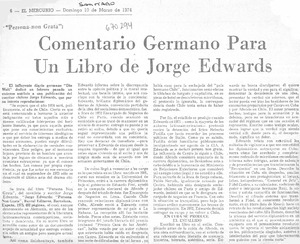 Comentario germano para un libro de Jorge Edwards. [artículo] El Mercurio (Santiago, Chile)-- mar. 10, 1974, p. 6. .