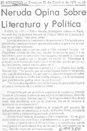 Neruda opina sobre literatura y política. [artículo] El Mercurio (Santiago, Chile)-- oct. 31, 1971, p. 35. .