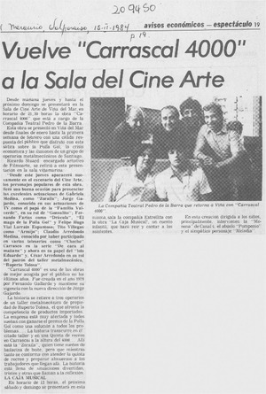 Vuelve "Carrascal 4000" a la sala del cine arte [artículo]. El Mercurio (Valparaíso). -- feb. 15, 1984, p. 19 .