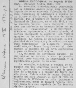 Obras escogidas de Augusto D'Halmar. [artículo] El Mercurio (Valparaíso, Chile)-- oct. 18, 1970, p. 3. .