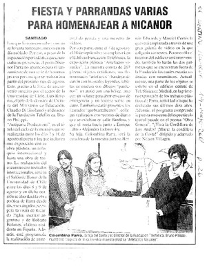 Fiesta y parrandas varias para homenajear a Nicanor [artículo] El Nortino (Diario : Iquique, Chile)-- mayo 19, 2001, p. 26. retr. .