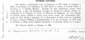 Victorino Lastarria. [artículo] El Observador (Quillota, Chile)-- nov. 1, 1974, p. 3. .