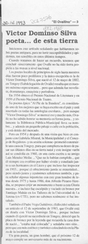 Víctor Domingo Silva poeta -- de esta tierra [artículo]. El Ovallino (diario : Ovalle, Chile)-- abr. 30, 1993, p. 3. .