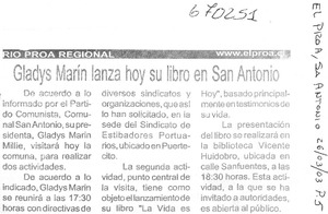 Gladys Marín lanza hoy su libro en San Antonio. [artículo] El Proa (San Antonio, Chile)-- mar. 26, 2003, p. 5. .
