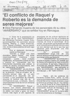 "El conflicto de Raquel y Roberto es la demanda de seres mejores" [artículo]. El Rancagüino. -- abr. 28, 1989, p. 15 .