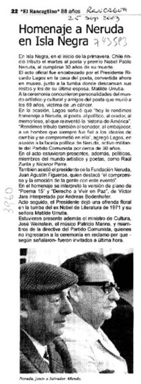 Homenaje a Neruda en Isla Negra [artículo] El Rancagüino (Diario : Rancagua, Chile)-- sept. 25, 2003, p. 22. retr. .