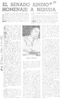El Senado rindió homenaje a Neruda. [artículo] El Siglo (diario : Santiago, Chile)-- nov. 5, 1971, p. 3. retr. .