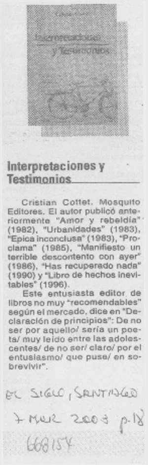 Interpretaciones y testimonios. [artículo] El Siglo (diario : Santiago, Chile)-- mar. 7, 2003, p. 18. il. .