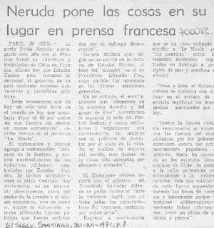 Neruda pone las cosas en su lugar en prensa francesa. [artículo] El Siglo (diario : Santiago, Chile)-- dic. 30, 1971, p. 8. .