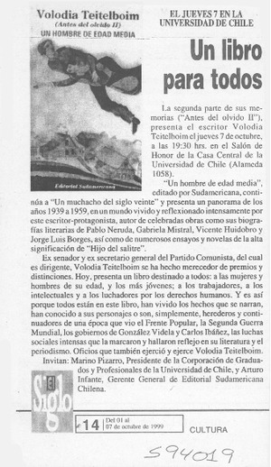 Un libro para todos [artículo] El Siglo (diario : Santiago, Chile)-- oct. 1, 1999, p. 14 il. .