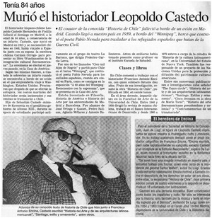 Murió el historiador Leopoldo Castedo [artículo] El Sur (diario : Concepción, Chile)-- oct. 12, 1999, p. 13 retr. .