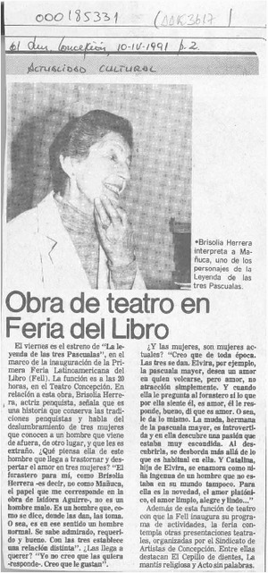 Obra de teatro en Feria del Libro [artículo]. El Sur (diario : Concepción, Chile)-- abr. 10, 1991, p. 2. .