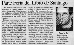 Parte Feria del Libro de Santiago. [artículo] El Sur (diario : Concepción, Chile)-- oct. 23, 2001, p. 9. retr. .