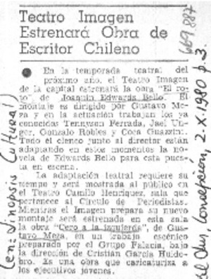 Teatro imagen estrenará obra de escritor chileno. [artículo] El Sur (diario : Concepción, Chile)-- oct. 2, 1980, p. 3. .