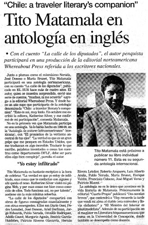 Tito Matamala en antología en inglés. [artículo] El Sur (diario : Concepción, Chile)-- ene. 12, 2003, p. 19. retr. .