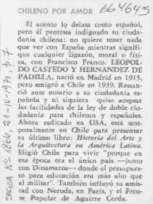 Chileno por amor. [artículo] Ercilla (Santiago, Chile)-- no. 1866 (abr. 21, 1971) p. 7. .