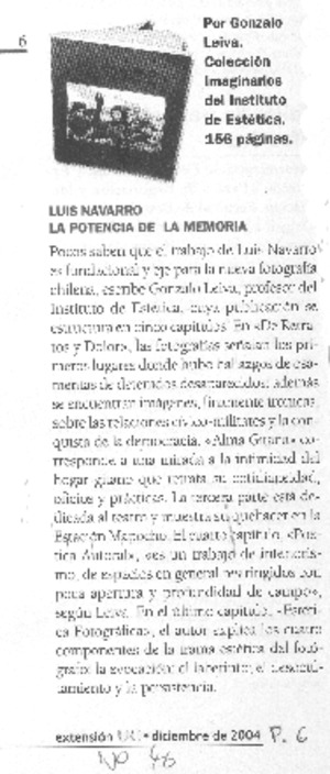 Luis Navarro. La potencia de la memoria [artículo] Extensión UC (Santiago, Chile)-- no. 46 (dic. 2004) p. 6 il. .