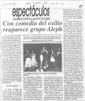 Con comedia del exilio reaparece grupo Aleph [artículo]. Fortín Mapocho. -- dic. 31, 1989, p. 27 .