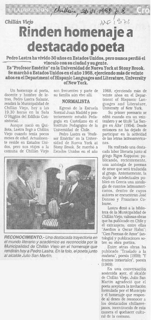 Rinden homenaje a destacado poeta [artículo]. La Discusión. -- jun. 26, 1998, p. 8. retr. .