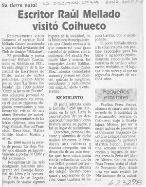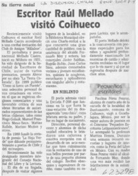 Escritor Raúl Mellado visitó Coihueco [artículo] La Discusión (Chillán) ene. 8, 2002, p. 4 .