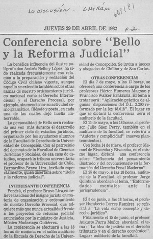 Conferencia sobre "Bello y la Reforma Judicial". [artículo] La Discusión (Chillán, Chile)-- abr. 29, 1982, p. 2. .