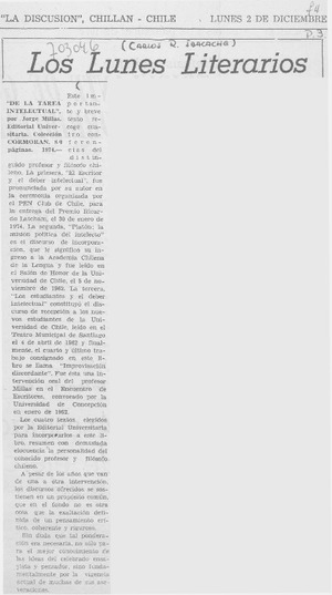 De la tarea intelectual". [artículo] La Discusión (Chillán, Chile)-- dic. 2, 1974, p. 3. .
