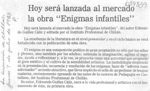 Hoy será lanzada a mercado la obra "enigmas infantiles". [artículo] La Discusión (Chillán, Chile)-- jul. 7, 1983. .
