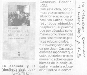 La Escuela y la (des)igualdad. [artículo] La Discusión (Chillán, Chile)-- mayo 4, 2003, p. B7. il. .