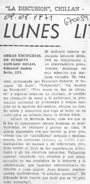 Obras escogidas. [artículo] La Discusión (Chillán, Chile)-- ago. 9, 1971, p. 3. .