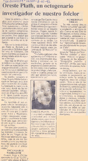 Oreste Plath, un octogenario investigador de nuestro foclor. [artículo] La Discusión (Chillán, Chile)-- nov. 8, 1992. retr. .