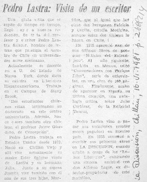 Pedro Lastra, visita de un escritor. [artículo] La Discusión (Chillán, Chile)-- jun. 16, 1981, p. 2. .
