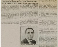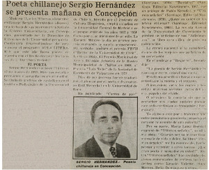 Poetachillanejo Sergio Hernández se presenta mañana en Concepción. [artículo] La Discusión (Chillán, Chile)-- mayo 14, 1985, p. 4. retr. .