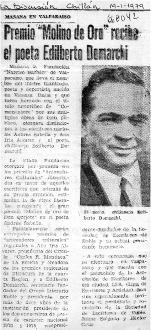 Premio "Molino de Oro" recibe el poeta Edilberto Domarchi. [artículo] La Discusión (Chillán, Chile)-- ene. 19, 1979, p. 2. retr. .