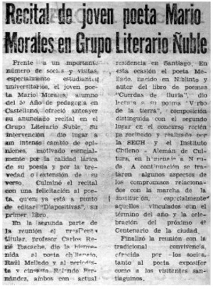Recital de joven poeta Mario Morales en grupo literario Ñuble. [artículo] La Discusión (Chillán, Chile)-- nov. 2, 1979, p. 2. .
