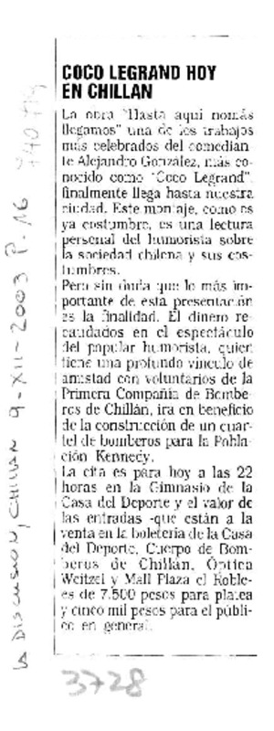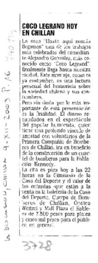 Coco Legrand hoy en Chillán. [artículo] La Discusión (Diario : Chillán, Chile)-- dic. 9, 2003, p. 16. .