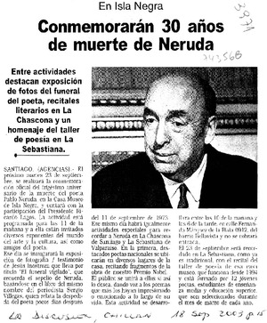 Conmemorarán 30 años de muerte de Neruda [artículo] La Discusión (Diario : Chillán, Chile)-- sept. 18, 2003, p. 15. retr. .