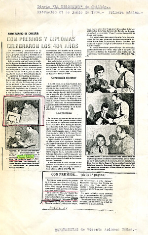 Con premios y diplomas celebraron los 404 años. [artículo] La Discusión (Diario : Chillán, Chile)-- jun. 27, 1984, p. 1. .