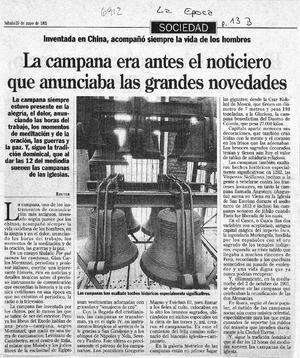 La campana era antes el noticiero que anunciaba las grandes novedades. [artículo] La Epoca-- mayo 29, 1993, p. B13. .