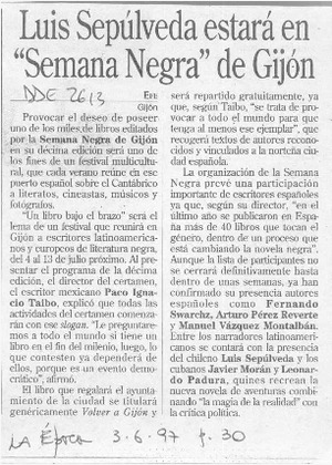 Luis Sepúlveda estará en "Semana negra" de Gijón [artículo]. La Epoca. -- jun. 3, 1997, p. 30 .