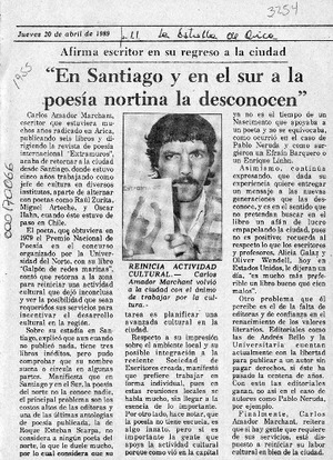 "En Santiago y en el sur a la poesía nortina la desconocen" [artículo]. La Estrella de Arica. -- abr. 20, 1989, p. 11 retr. .