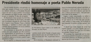 Presidente rindió homenaje a poeta Pablo Neruda. [artículo] La Estrella de Arica (Diario : Arica, Chile)-- sept. 24, 2003, p. B3. retr. .