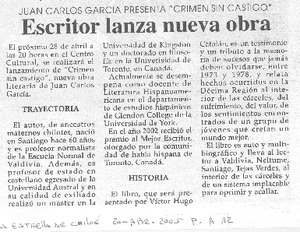 Escritor lanza nueva obra [artículo] La Estrella de Chiloé (Diario : Castro, Chile) abr. 20, 2005, p. A12. .