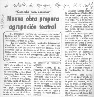 Nueva obra prepara agrupación teatral. [artículo] La Estrella de Iquique (Iquique, Chile)-- oct. 26, 1977, p. 7. .
