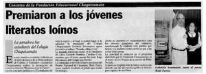 Premiaron a los jóvenes literatos loínos [artículo] La Estrella del Loa (Diario : Calama, Chile)-- nov. 8, 2003, p.27. retr. .