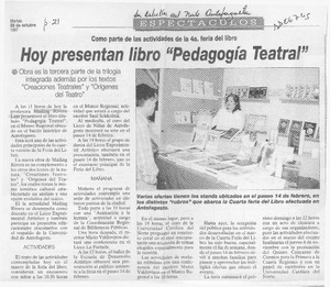 Hoy presentan libro "Pedagogía teatral" [artículo]. La Estrella del Norte. -- oct. 28, 1997, p. 21 .