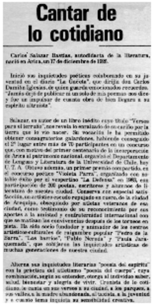 Cantar de lo cotidiano [artículo] La Estrella (Diario : Arica, Chile)-- mayo 30, 1985, p. 6. .
