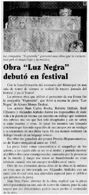 Obra "Luz Negra" debutó en festival [artículo] La Estrella (Diario : Iquique, Chile) nov. 6, 2003, p. A24. retr. .