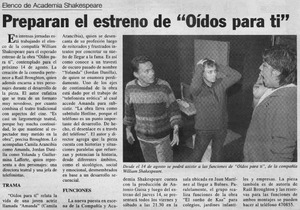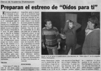 Preparan el estreno de "Oídos para ti" [artículo] La Estrella (Diario : Valparaíso, Chile)-- ago. 3, 2003, p. A23. il. .